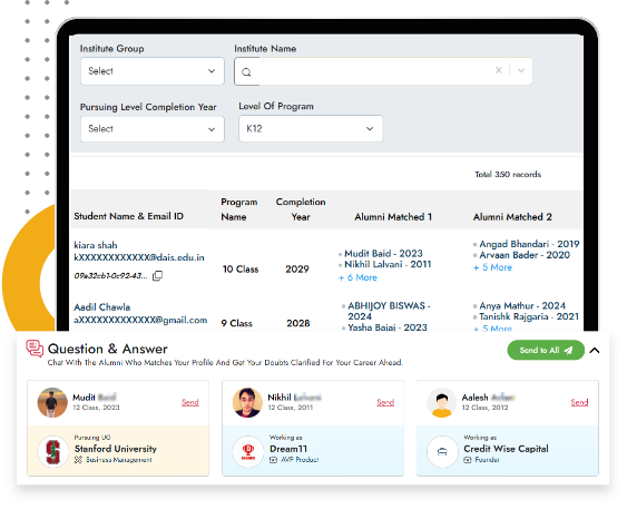 Our AI algorithm matches each student with 40+ alumni across batches enabling in-depth one-on-one conversations. Automatic reminders go to the alumni who get these student queries to ensure timely response.