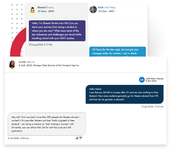 While profile information and videos do give a glimpse of the alumni's journey and general guidance, it's even better to get in a one-to-one personal conversation with them and ask specific queries to get guidance.