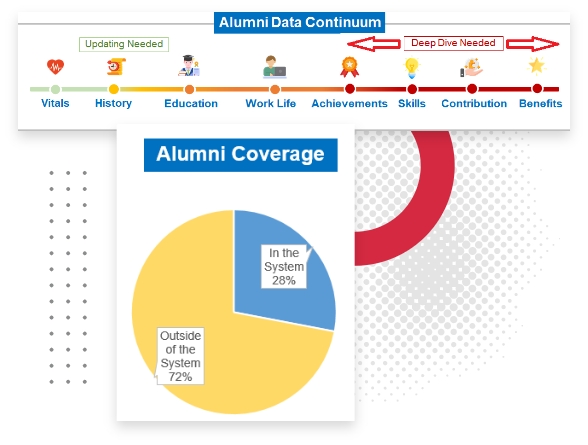 Our research across multiple institutions shows that for top ranked institutions also, the data is not available for more than 72% alumni. Periodic review and update of alumni data is either planned poorly or never planned.