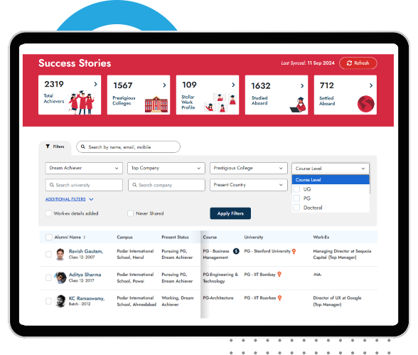 Within few clicks you can extract the alumni success stories for marketing campaigns as well as identify the potential alumni who can contribute at different levels in form of student guidance, mentorship, campus recruitment or donations.