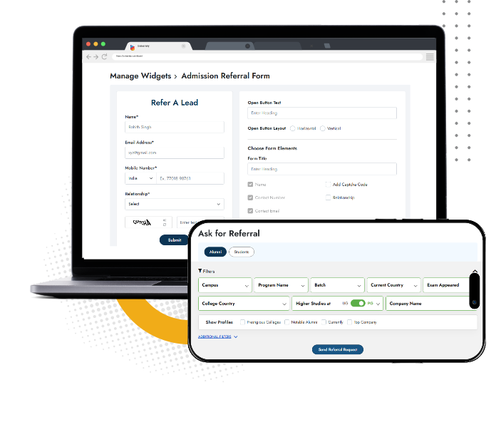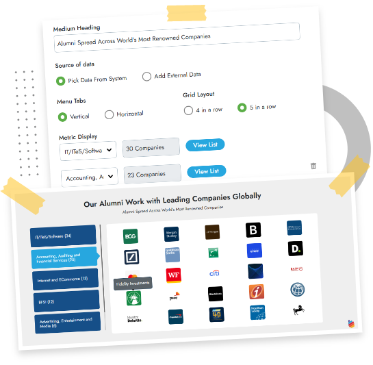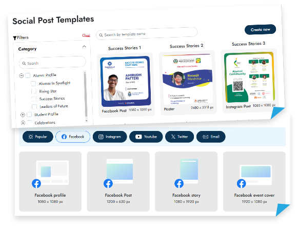 With our pre-built poster templates you can pick the alumni success stories from the platform and convert them into images compatible for printed posters or soft copy version for display on LED screens in your campus.