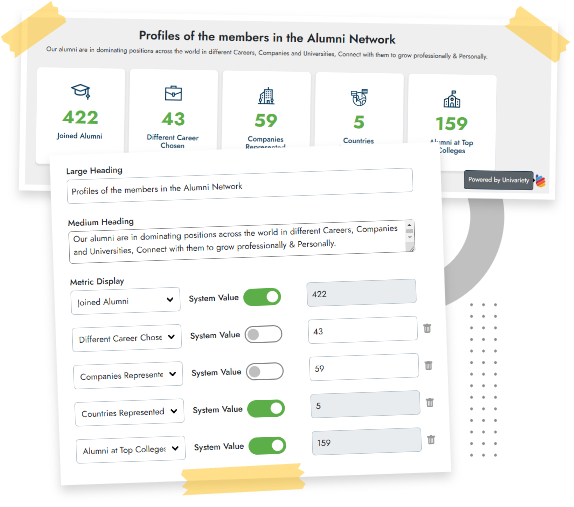 With our website widgets, alumni profiles and statistics can be displayed in real-time directly on your website. Effortless integration removes the need to rely on IT or web admins to keep the website information updated.