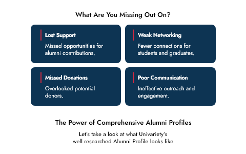 A significant shortfall in alumni data means your institution is missing out on crucial opportunities to engage with and benefit from the support of alumni who could greatly contribute to your growth. This is how we do it at Univariety-