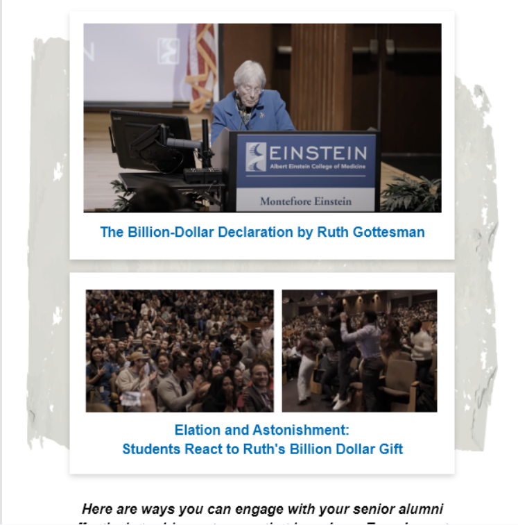 Her monumental contribution highlights the power of engaging with senior or older alumni. Trust and Personal Connections can drive transformative impact.