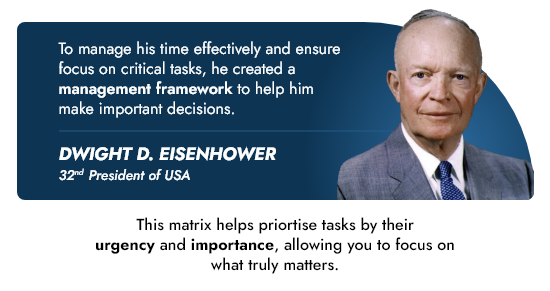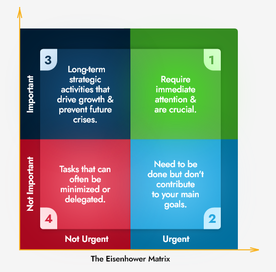 The Eisenhower Matrix is a management tool that helps you prioritize tasks based on their urgency. Developed by D. Eisenhower, it divides tasks into four quadrants: (1) Important and Urgent, (2) Important but Not Urgent, (3) Not Important but Urgent, and (4) Not Important and Not Urgent.